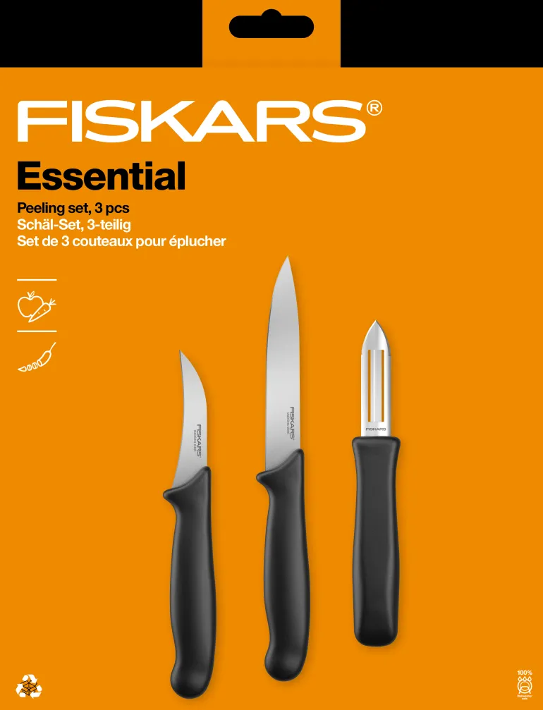 Fiskars Essential -kuorimasetti sisältäen kuorima- ja vihannesveitsen sekä kuorijan. Laadukkaasta ruostumattomasta teräksestä.
