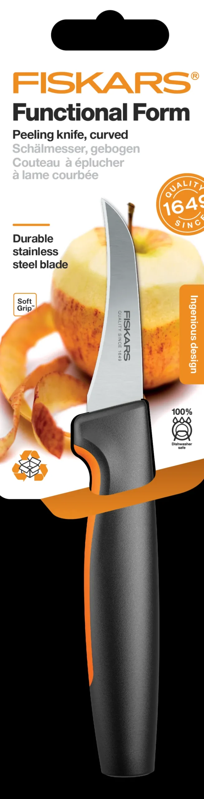 Kompakti veitsi, jossa on kaareva terä pyöreiden juuresten ja hedelmien tarkkaan kuorintaan. Veitsenterä on valmistettu kestävästä japanilaisesta ruostumattomasta teräksestä. Ergonomisesti suunnitellussa kahvassa on hyvin asennettu sormensuojus. Konepesunkestävä.