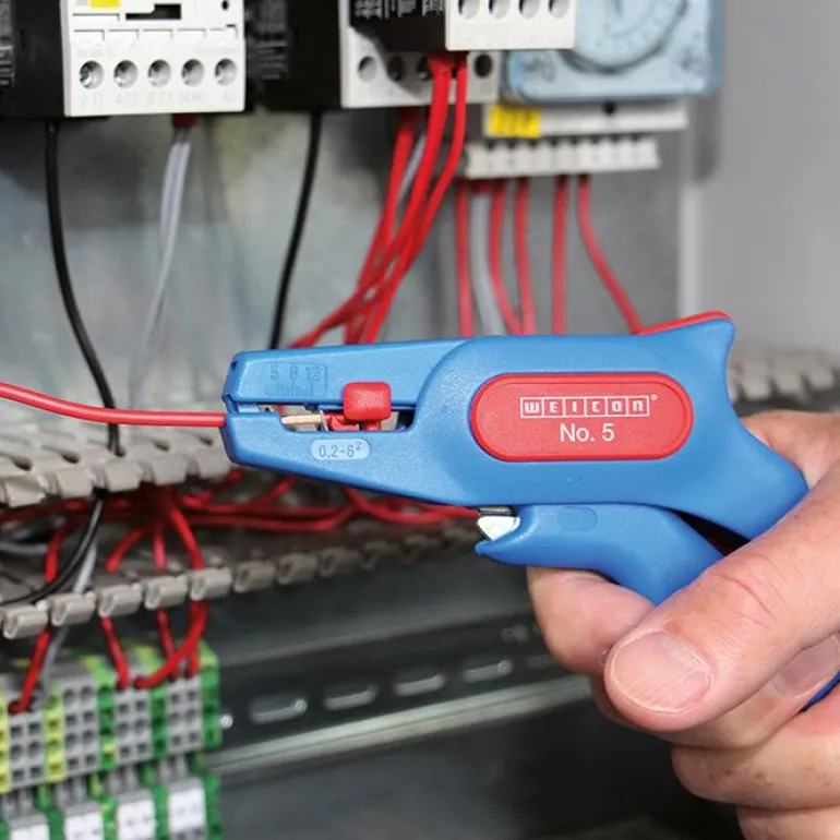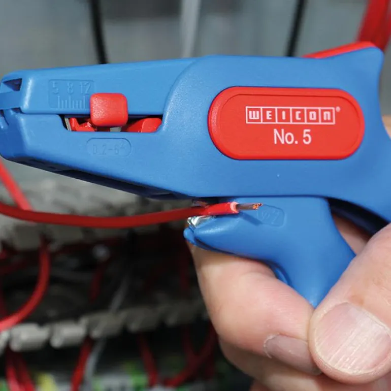 Weicon No. 5 on itsesäätyvä kuorintapihti kaapelikoolle 0,2-6,0 mm², jossa on pituuslukitsin ja leikkuri.