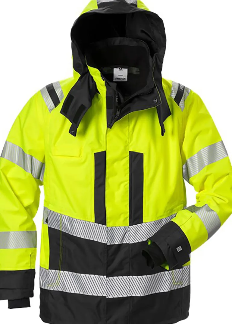 Kuoritakki veden- ja tuulenpitävästä Airtech-materiaalista. Hengittävä. Takissa on irrotettava ja säädettävä huppu, fleecevuorillinen kaulus, heijastavat yksityiskohdat olkapäillä, verkkovuori ja pidennetty selkäosa. Kuoritakki on Öko-Tex-sertifioitu ja hyväksytty standardin EN ISO 20471 luokan 2 (koot XS–S) ja luokan 3 (koot M–4XL) sekä standardin EN 343 3/3 mukaisesti. Se on testattu teollisen pesustandardin ISO 15797 mukaisesti.