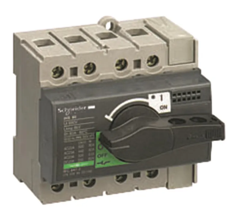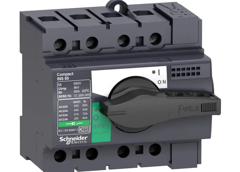 Kuormankytkin INS40 on 4-napainen ja 40 A. Se on varustettu mustalla nupilla.