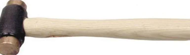 Kuparivasara vaihdettavalla iskupinnalla. Vasaran iskupää adusoitua materiaalia ja varsi hikkoripuuta.