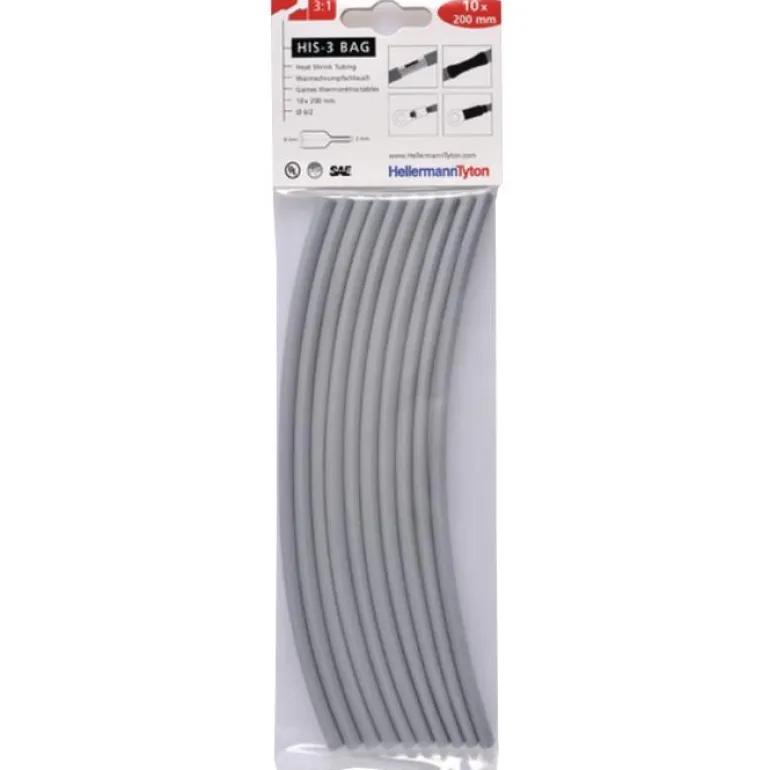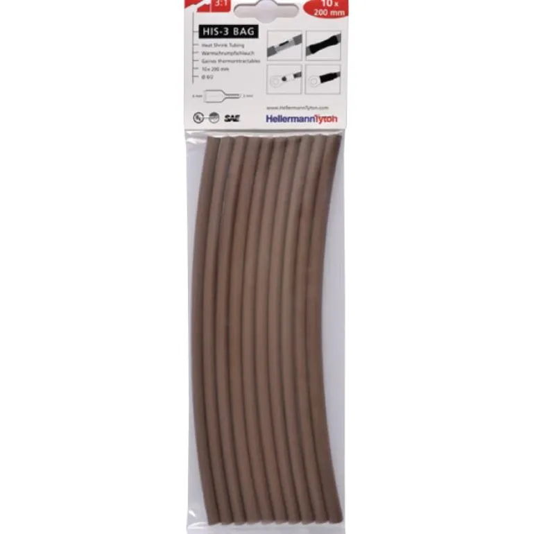 HIS-3 Bag -pakkaus sisältää ohutseinämäisiä ja taipuisia kutistemuoviletkuja, jotka on valmistettu ristisilloitetusta polyolefiinista. Kaapelien ja liitinten eristämiseen ja suojaamiseen. Letkujen halkaisija on 6/2 mm (kutistumaton/kutistettu). Pakkaus sisältää 10 määrämittaista 200 mm:n letkua.