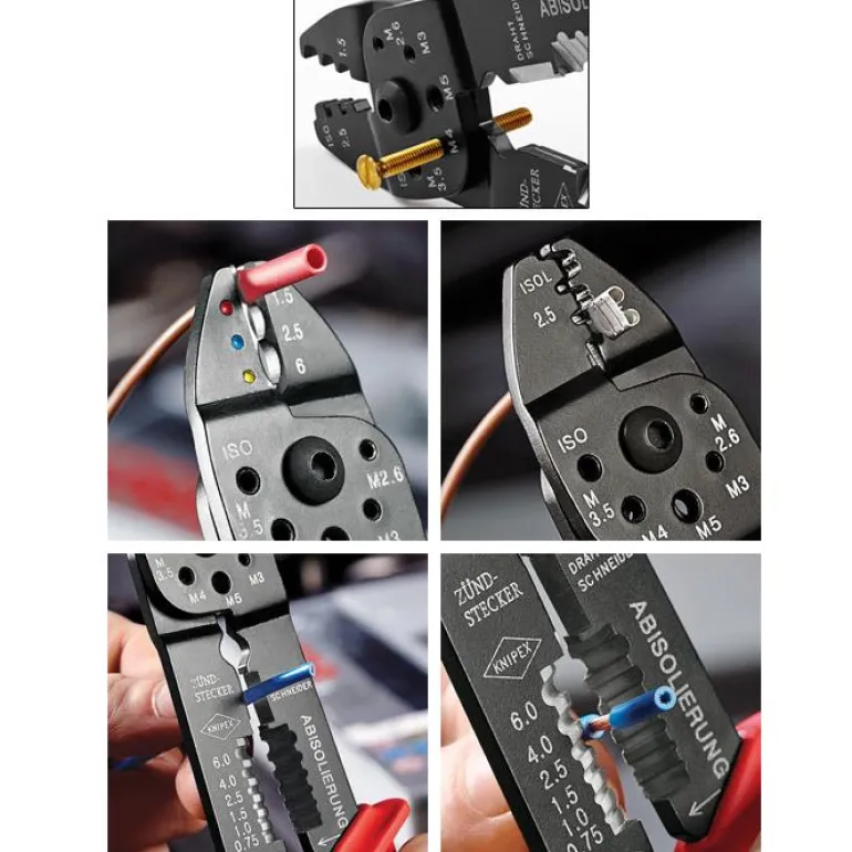 - Kaapelinleikkaukseen, johtojen kuorintaan, eristettyjen ja eristämättömien kaapelikenkien, johtoliittimien ja avointen liittimien puristamiseen.