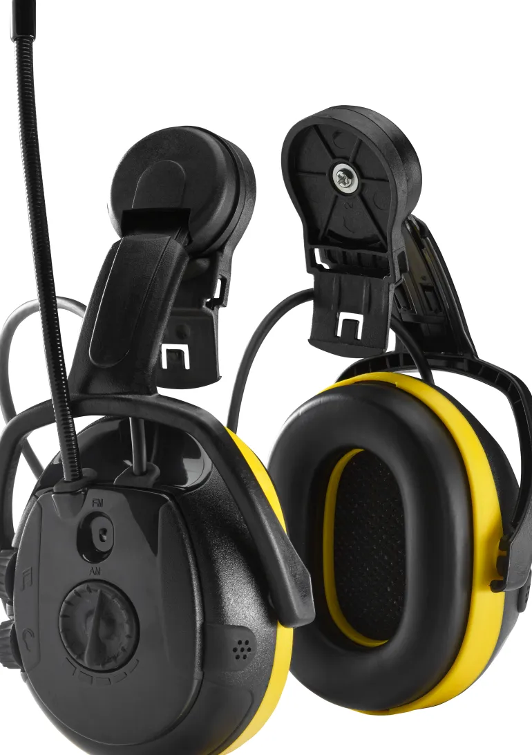 Kuulosuojain, jossa kypäräkiinnikkeet, sisäänrakennettu radio ja ympäristönkuuntelu. REACTilla voit kuunnella AM/FM-radiota ja keskustella työkavereiden kanssa samalla, kun suojaat kuuloasi kovilta ääniltä.