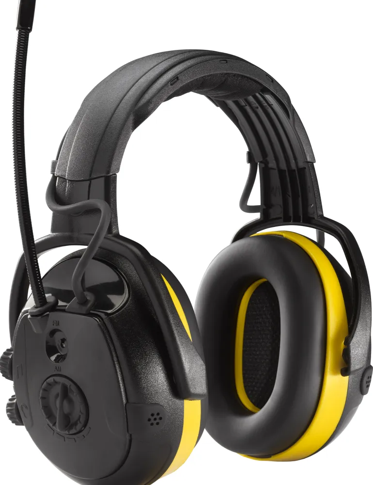 Kuulosuojain, jossa päälakisanka, sisäänrakennettu radio ja ympäristönkuuntelu. REACTilla voit kuunnella AM/FM-radiota ja keskustella työkavereiden kanssa samalla, kun suojaat kuuloasi kovilta ääniltä.