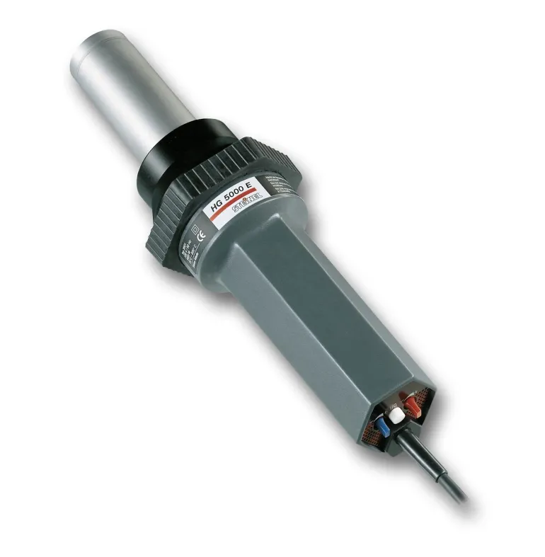 HG 5000 E on erittäin tehokas kuumailmatyökalu (suora malli), jota käytetään silloin, kun tarvitaan suuri määrä ilmaa ja korkea lämpötila. Varustettu kuusikulmaisella kädensijalla, joka on helppo kiinnittää jalustaan tai muuhun kiinnikkeeseen liikkumatonta käyttöä varten. Lämpötilan ja ilmamäärän säätäminen tapahtuu portaattomasti käyttämällä takaosassa olevia helppokäyttöisiä pyöriviä säätimiä Älykäs ohjaus, joka säätää ilmamäärää suhteessa eri lämpötiloihin. Kun lämmityselementti on kulunut, se on helppo vaihtaa ja kalibroida muutamalla liikkeellä.