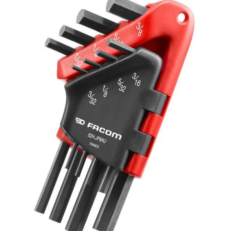 Facom 82H.JP8AU Kuusioavainsarja, joka koostuu kahdeksasta erikokoisesta kuusiokoloavaimesta. Toimitetaan pakattuna kompaktiin koteloon, josta tarvittava koko on helppo valita.