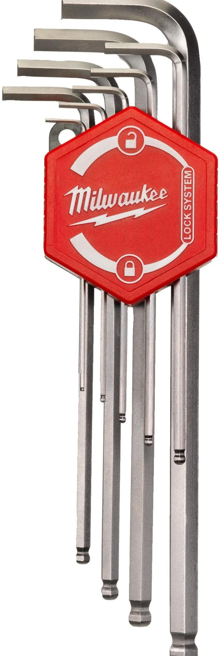 Käännä ja lukitse kotelo pitääksesi avaimet paikoillaan. Pyöreä pää mahdollistaa pääsyn ruuviin jopa 30 asteen kulmassa. Kokomerkinnät oikean avaimen löytämiseksi. MILWAUKEEn työkalun varmennusosien reiät korkealla työskentelyä varten. Koot: 1.5, 2, 2.5, 3, 4, 5, 6, 8 ja 10 mm.