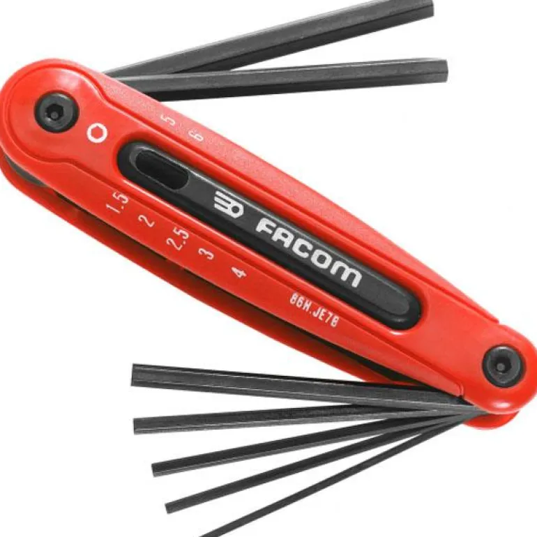 Facom 86H.JE7A on kuusiokoloavainsarja, joka sisältää 7 erikokoista avainta. Erittäin kompakti pidike ja mukava ote. 90 asteen kulmaan sijoitettu pysäytin parantaa kiristyskykyä.