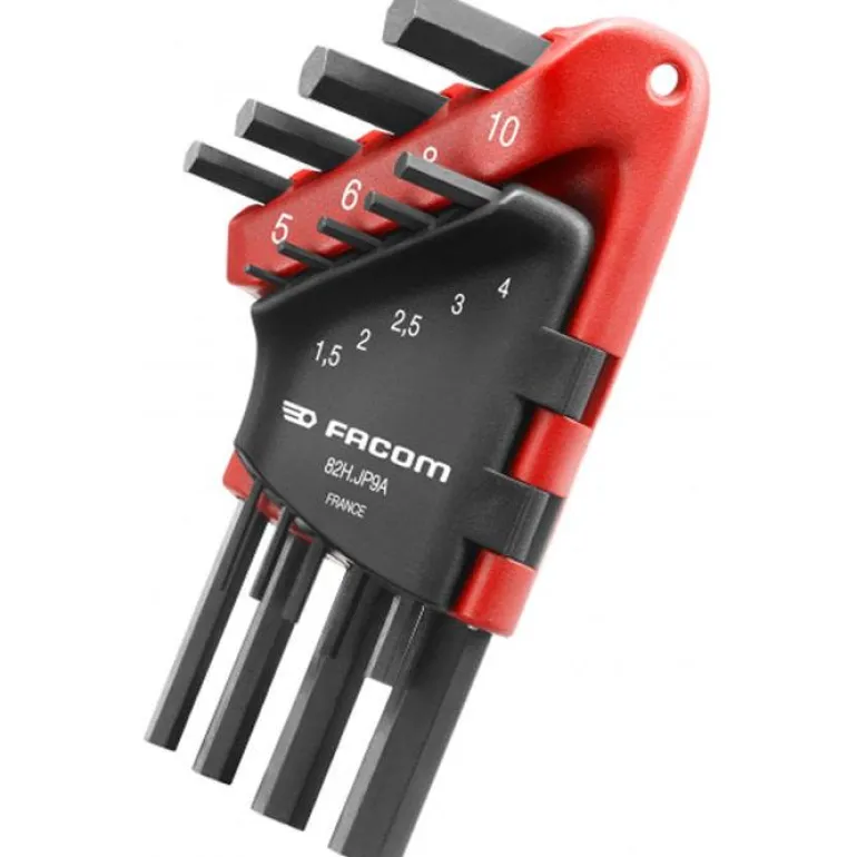 Facom 82H.JP9A on 9-osainen kuusiokoloavainsarja, koot 1,5–10 mm. Avaimet on pakattu kompaktiin koteloon, josta tarvittava koko on helppo valita.