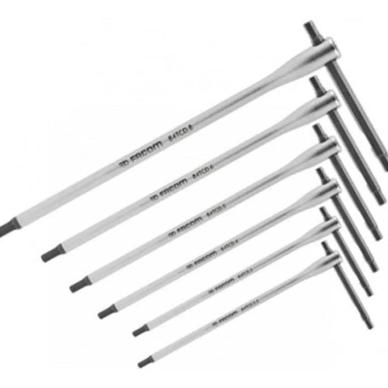 Facom 84TCD.J6 on kuusiokoloavainsarja, jossa on 6 osaa. Avaimissa on liukuva poikkituki, jossa on T-kahva paremman ulottuvuuden takaamiseksi. Soveltuu esimerkiksi moottoripyöräkorjaamoihin, autojen kokoonpanoon ja teolliseen huoltoon. Lukitustappi estää poikkitukea liukumasta ulos ja fosfaattikärjet, jotka sopivat täydellisesti ruuveihin, parantavat tarkkuutta.