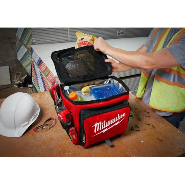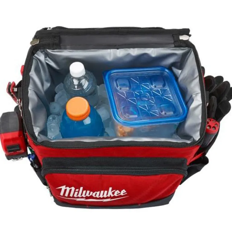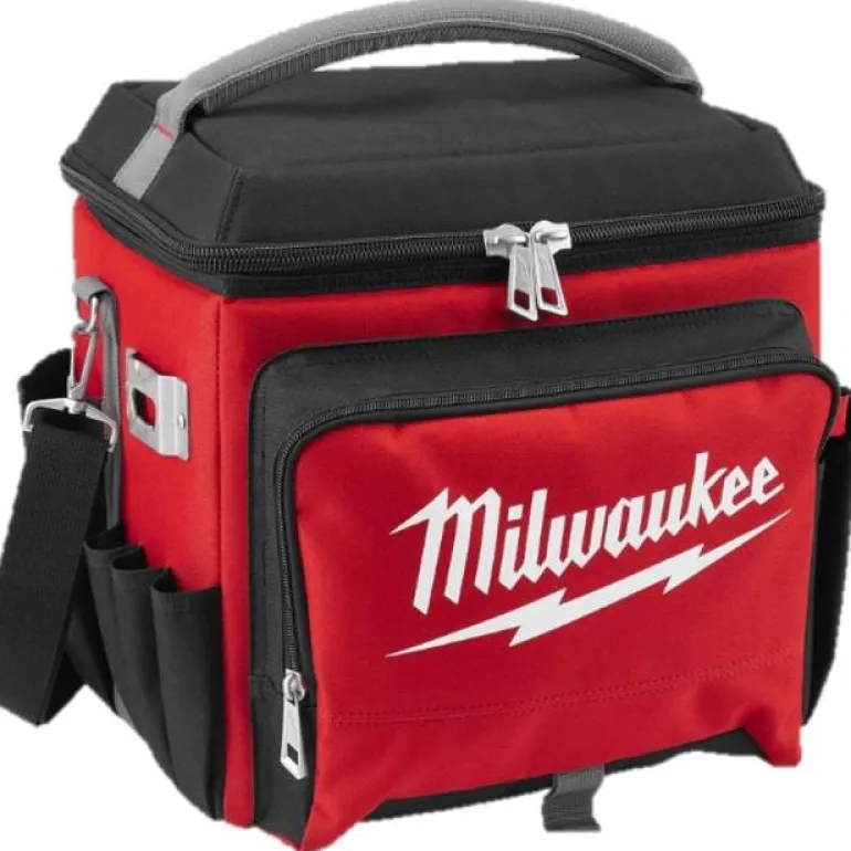 Milwaukee Jobsite Cooler on kylmälaukku kaksoiseristyksellä, pitää viileyden jopa 24 tuntia. Kylmälaukku ei vuoda tiiviiden saumojen ansiosta. Se on valmistettu kestävistä materiaaleista ja siinä on laadukas metallivetoketju. Ulkopuolella on olkahihna, jossa metallikiinnikkeet.
