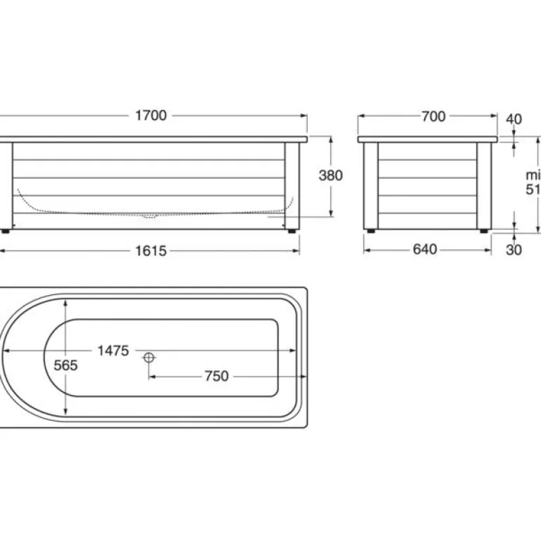 Kylpyamme yhdelle henkilölle, jonka tilavuus 190 l. Pohjaventtiilillä, mutta ilman paneelia. Mitat: 1700 x 700 x 510 mm (P x L x K). Syvyys 420 mm.