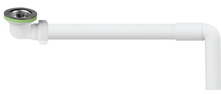 Valkoinen kylpyammeen poistoputki (120 x 835 mm). 90 asteen kulma pohjaventtiilillä. Liitäntä 32 mm.