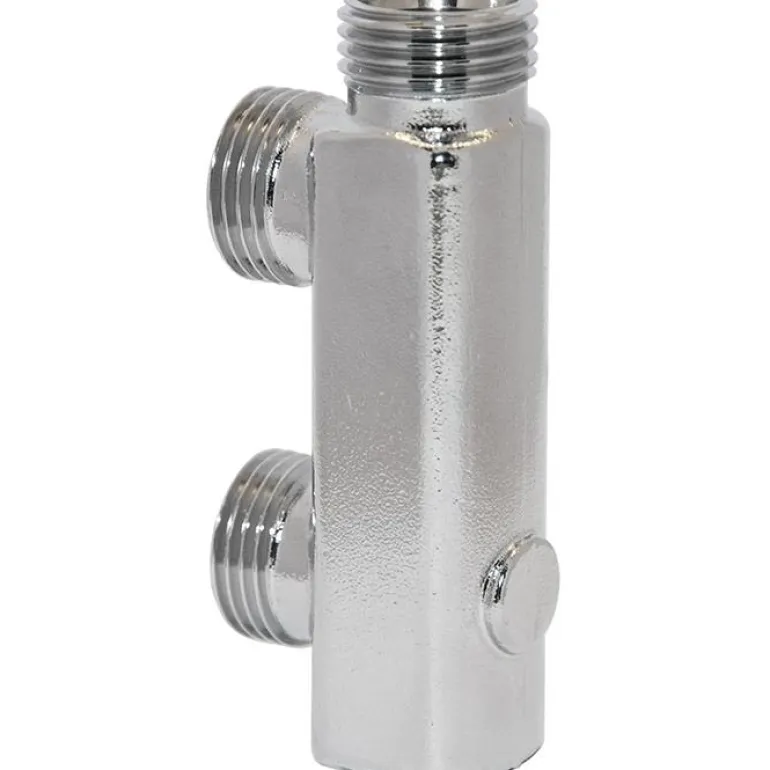3-putkinen 40 c/c kylpyhuoneen jakotukki, liitettäväksi Vatette-peitelaippoihin tai seinän läpivientijärjestelmään kylpyhuoneen pesualtaan alle. Varustettu G3/8-tulpalla, ulkoinen lisäliitäntä esimerkiksi WC-istuimeen.