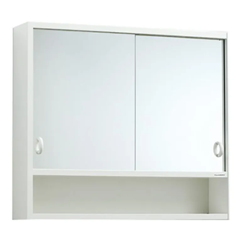 Kylpyhuonekaappi, jonka sisäpuolella puinen irrotettava hylly ja ulkopuolella toinen hylly. Korkeus 52 cm, kaksi liukuovea peililasista.