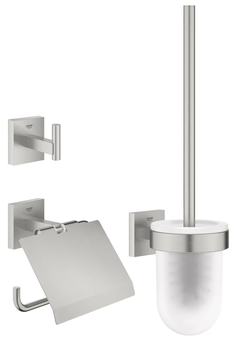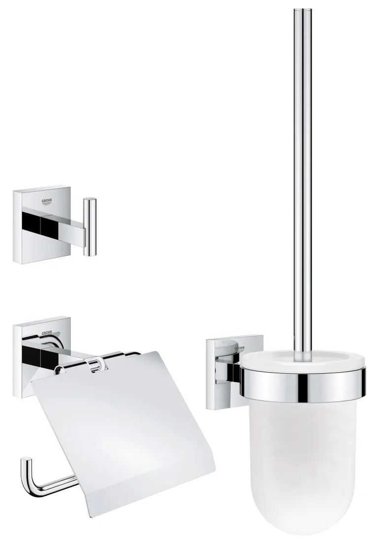 Grohe Start Cube on 3-osainen tarvikesarja kylpyhuoneeseen tai WC-tilaan. Laadukkaat osat tyylikkäällä muotoilulla, jotka on helppo asentaa. Käytännöllinen setti sisältää WC-paperitelineen (kannella), pyyhekoukun ja WC-harjan telineellä/pitimellä.