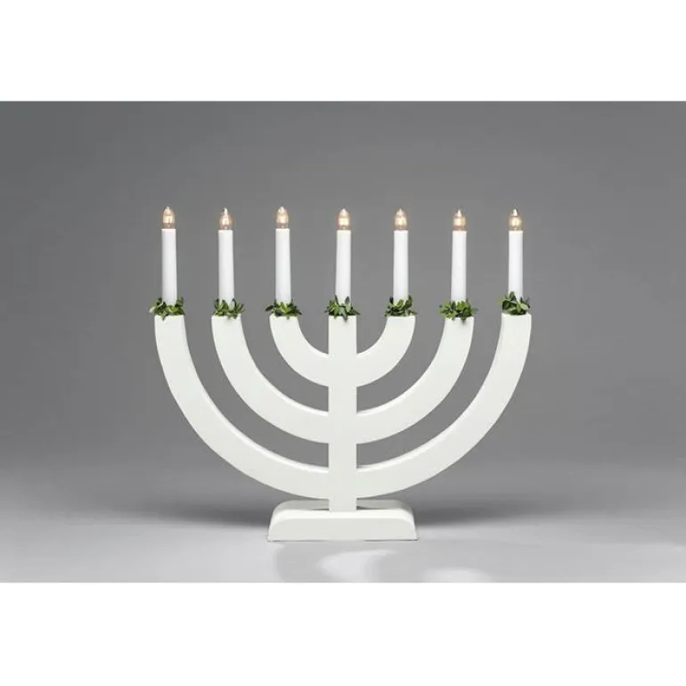Konstsmide 3987-219 on sähkökynttelikkö valkoista puuta, 7 kynttilää ja vihreät koristeet. Sähkökynttelikkö on 38 cm korkea ja 44 cm leveä. Virtakytkin johdossa.