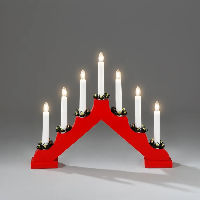 Klassinen punaiseksi maalattu puinen sähkökynttelikkö, jossa on 7 valopistettä. Sähkökynttelikön kirkkaus on 6 luumenia, ja se on varustettu valkoisella 170 cm:n pituisella johdolla, jossa on kytkin.