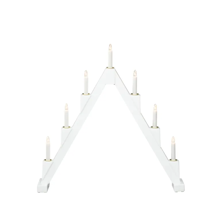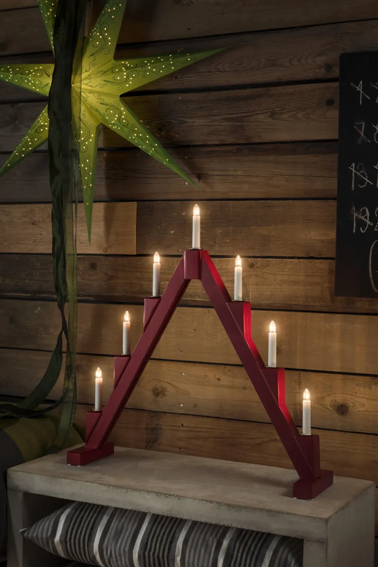 Konstsmide 3590-510 on puinen kokoontaitettava sähkökynttelikkö 7 kynttilällä. Väri punainen ja messinkiset koristerenkaat.