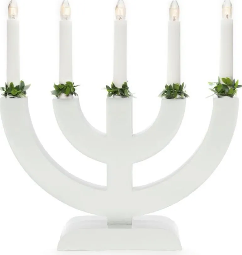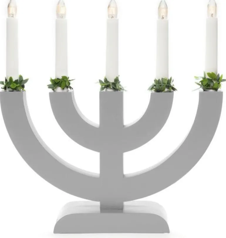 Konstsmide 3988-319 on puinen sähkökynttelikkö 5 kynttilällä. Harmaa vihreillä manseteilla. 230V/IP20.