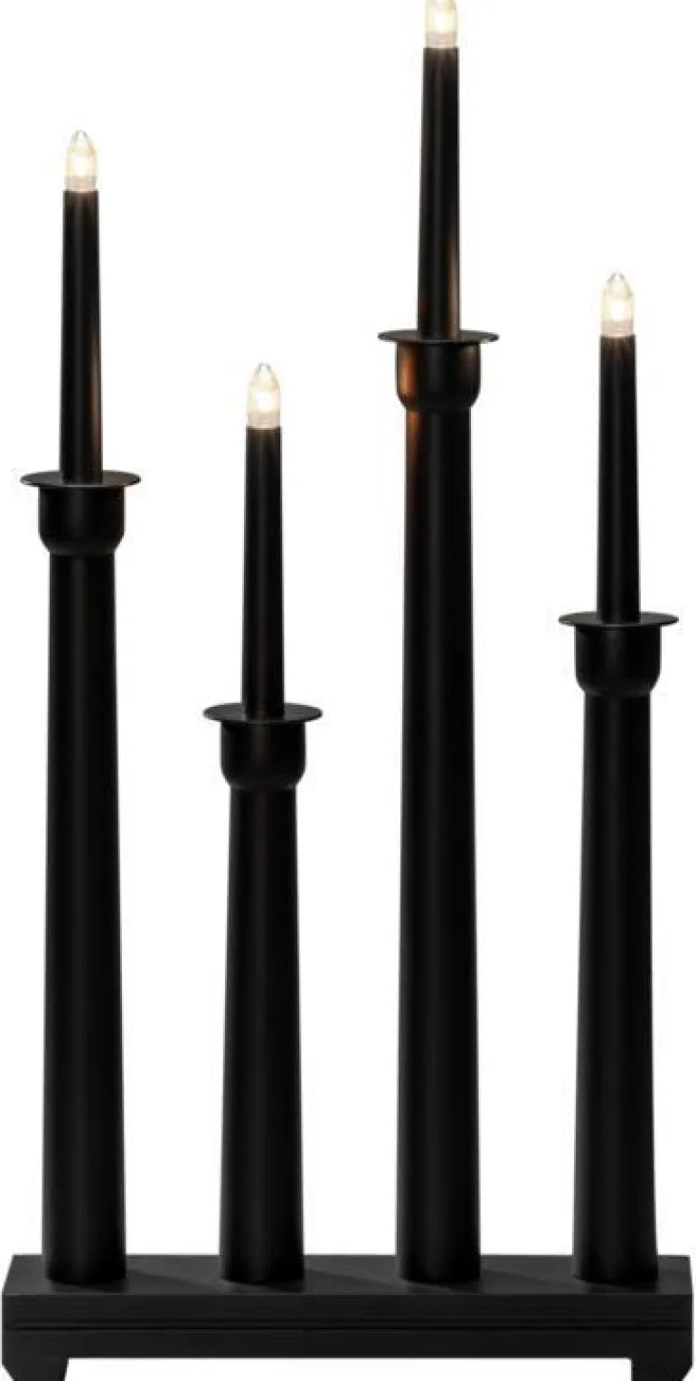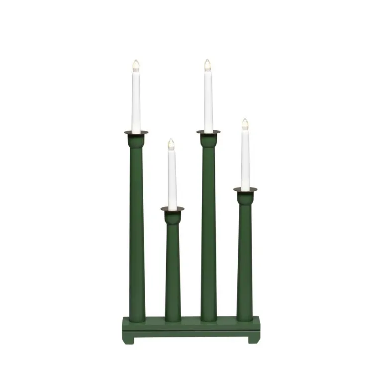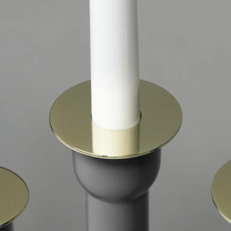 Konstsmide 3977-310 on puinen sähkökynttelikkö 4 kynttilällä. Harmaa, koristerenkaat messingistä. 230 V/IP20.