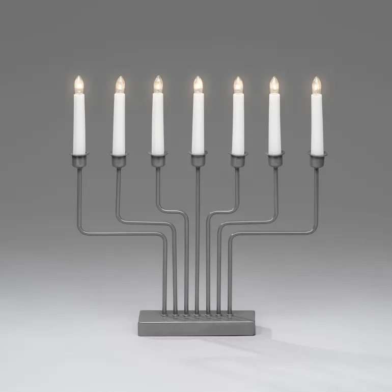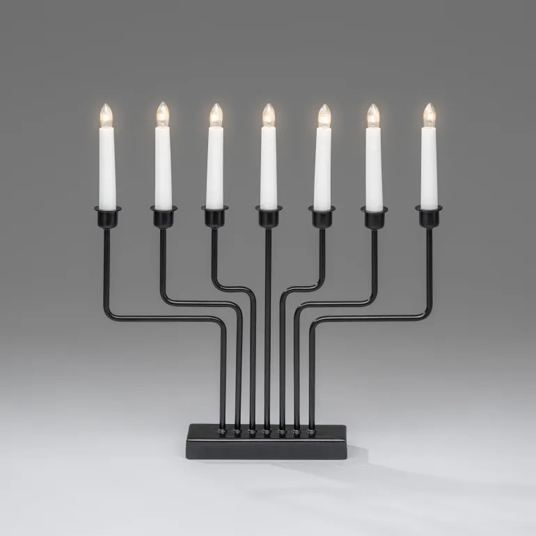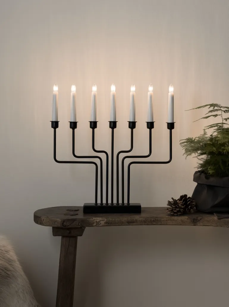 Konstsmide 3528-710TR on sähkökynttelikkö 7 kynttilällä. Materiaalina metalli, ja muotoilultaan selkeän yksinkertainen joka sopii moniin erilaisiin sistustuksiin. Väri musta.