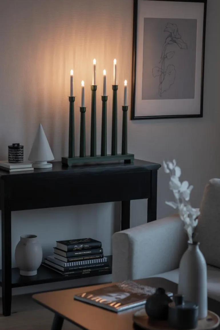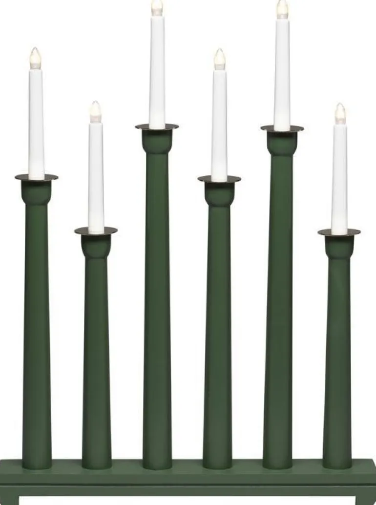 Konstsmide 3978-950 on puinen sähkökynttelikkö 6 kynttilällä. Vihreä, koristerenkaat messingistä. 230V/IP20.