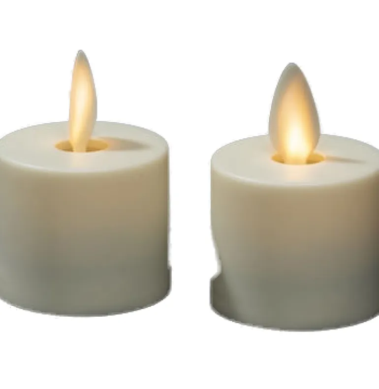 Kaksi pientä kermanvalkoista kynttilää. Korkeus 5 cm ja kukin saa virtansa 3 voltin paristosta. 5 tunnin ajastintoiminto. Paristot eivät sisälly toimitukseen.