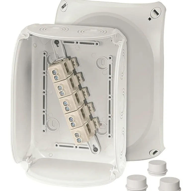 Kytkentärasia liittimellä, integroidut elastiset kalvot, jotka voidaan helposti irrottaa ennen kaapelin asettamista kaapeliliitosten kautta. Kaapelin läpivienti pohjassa mahdollistaa kansiiruuvien tiivistämisen ilman lisävarusteita. Sisältää kiinnityshihnat ja ulkoseinäkiinnittimet