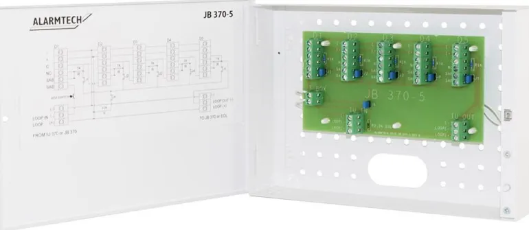 JB 370-5 on kytkentärasia, joka helpottaa lasirikkoilmaisimen GD 370 asentamista. Ilmaisimen johdin kytketään viemällä johdin suoraan rasian liittimiin ja siitä seuraavaan lasirikkoilmaisimeen. Kytkentärasia kytkee maks. 5 x GD 370 IU 370 ja/tai useita JB 370/JB 370-2/JB 370-5. JB 370-5:ssa on sisäänrakennettu vastus lasirikkohälytyksen kuittaamiseksi (valitsimella) sekä ilkivaltasuojausta varten. JB 370-5:ssä on myös valitsin, joka mahdollistaa GD 370:n käytön releellä IU 370:een. Kun useampi GD 370 asennetaan tilaan, jossa voidaan käyttää yhteistä kytkentäpistettä, JB 370-5 on erinomainen valinta kytkentärasiaksi (maks. 5 kpl per kytkentärasia). JB 370-5 toimii myös päätevastuksena viimeisessä GD 370:ssa.