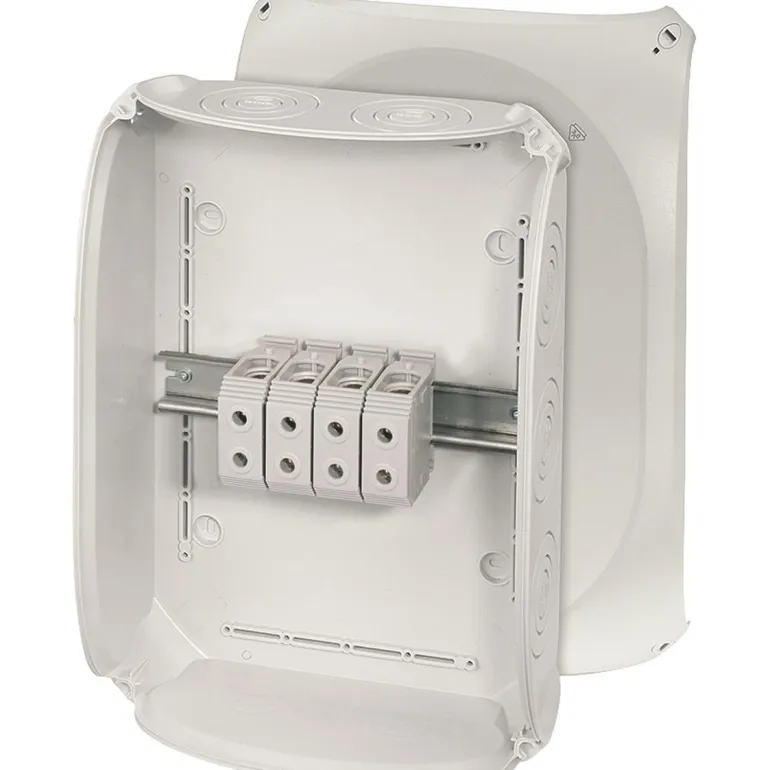 Kytkentärasia liittimellä, integroidut elastiset kalvot, jotka voidaan helposti irrottaa ennen kaapelin asettamista kaapeliliitosten kautta. Kaapelin läpivienti pohjassa mahdollistaa kansiiruuvien tiivistämisen ilman lisävarusteita. Sisältää kiinnityshihnat ja ulkoseinäkiinnittimet