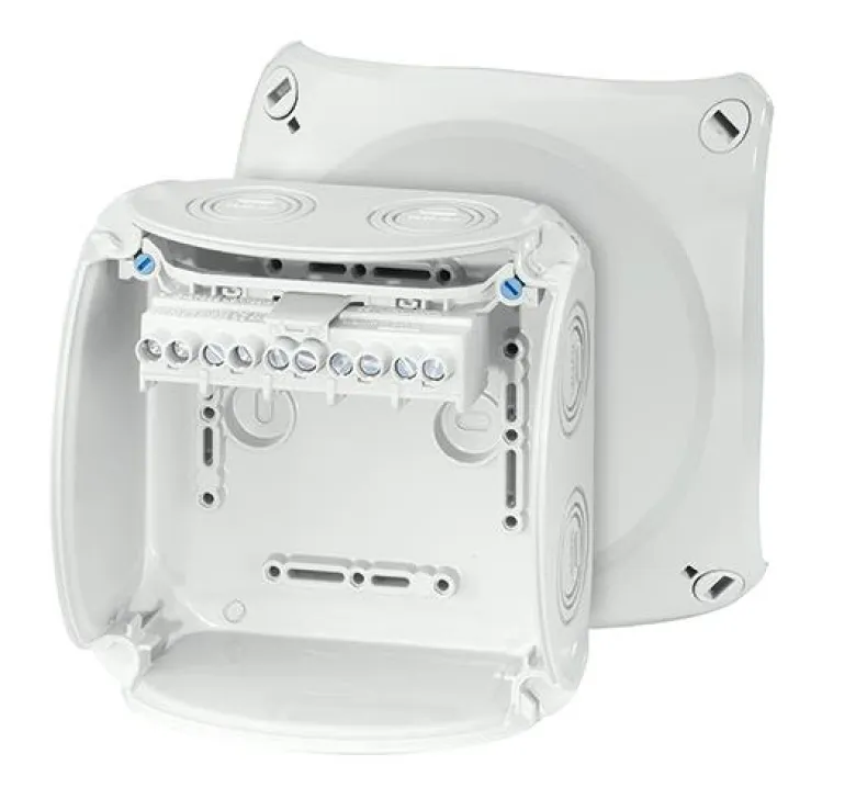 Kytkentärasia, jossa on liitin. Kannessa on pikalukitus ja näkyvä lukitusasento. Monivaiheiset läpivientiaukot erikokoisille kaapelikiinnikkeilleja myös kaapeliläpivienti pohjassa Kaikki liittimet kahdella kiinnikkeellä napaa kohden, jotka voidaan asettaa eri liitinasentoihin ja eri kiinnitysvaihtoehdoilla. Korotetut liittimet, joissa on runsaasti tilaa liitännöille sekä kyky liittää eri johdinkokoja ja kaapelityyppejä Laatikon mukana toimitetaan aina ulkoiset kiinnittimet.