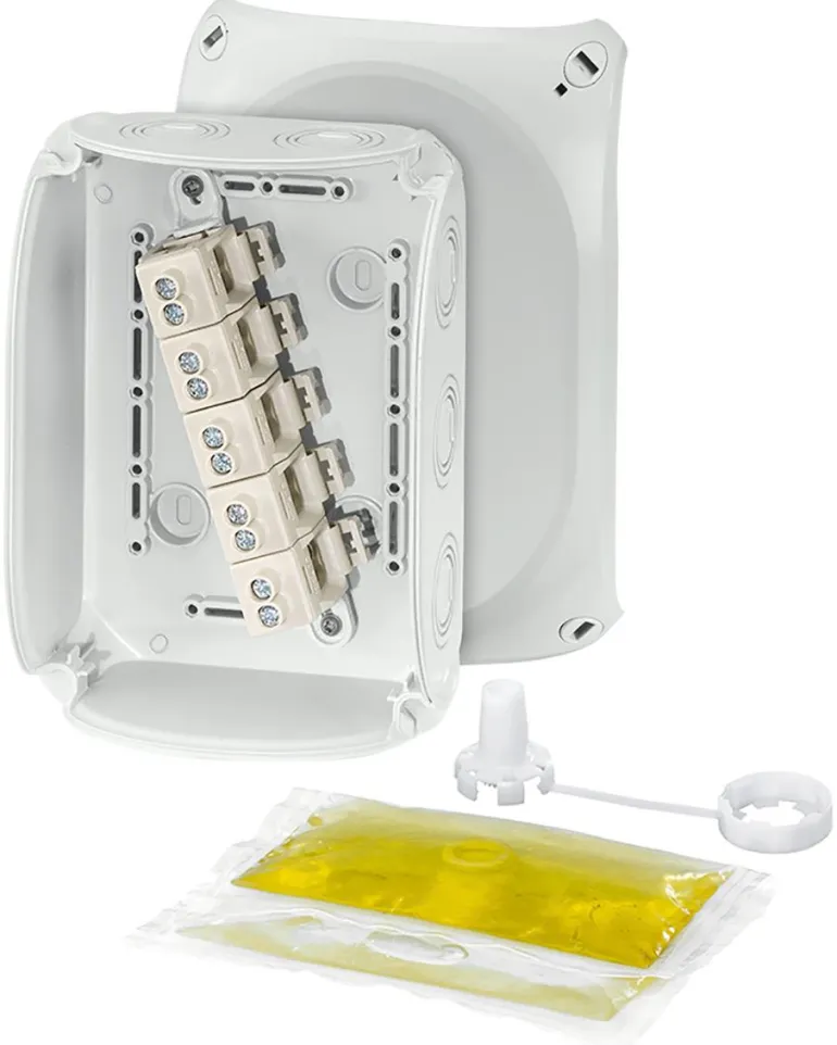 Kytkentärasia harmaata polykarbonaattia, kaksikomponenttinen geeli. Kun geeli on kovettunut, rasiasta tulee täysin vedenpitävä ja se mahtuu alttiisiin ympäristöihin.