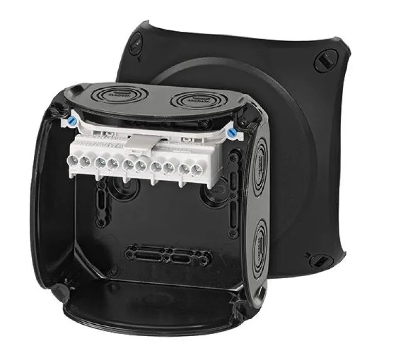 Kytkentärasia lasikuituvahvistettua polykarbonaattia vaativiin ympäristöihin asennettavaksi. Nimellisjännite 690V. Hyvä UV-kestävyys. Laatikossa on 5-napainen liitin kaapeleille Toimitetaan läpivientiaukkoineen ja aukoilla erikseen tilattaville ruuviliittimille. Laatikot ovat Länsförsäkringarin suosittelemia käytettäväksi maatalouskäyttöön.Kansissa on pikalukitus ja näkyvä lukitusasento. Monivaiheiset läpivientiaukot erikokoisille kaapelikiinnikkeilleja myös kaapeliläpivienti pohjassa Kaikki liittimet kahdella kiinnikkeellä napaa kohden, jotka voidaan asettaa eri liitinasentoihin ja eri kiinnitysvaihtoehdoilla. Korotetut liittimet, joissa on runsaasti tilaa liitännöille sekä kyky liittää eri johdinkokoja ja kaapelityyppejä. Laatikon mukana toimitetaan aina ulommat liittimet