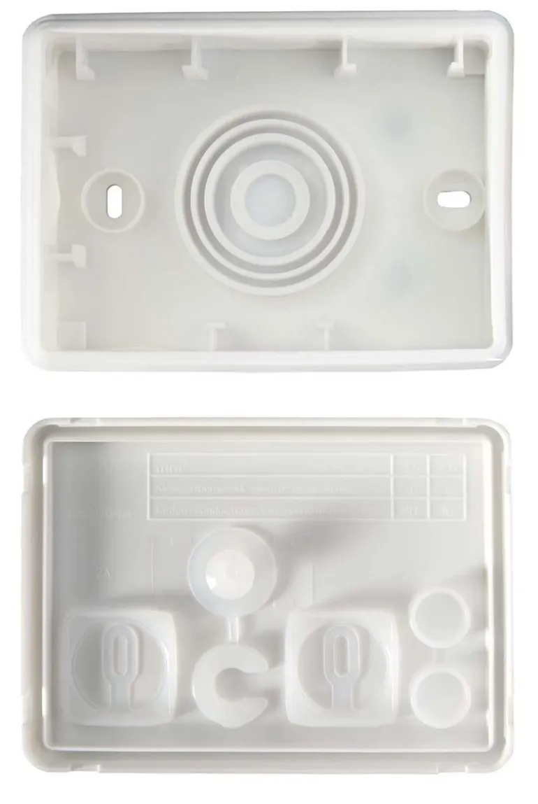 Kapseloitu malli valkoisesta halogeenittomasta 2-komponenttimateriaalista. Pikakiinnitettävä kansi ilman ruuveja. Upotetut kalvonipat, joista 2 pohjassa. Toimitetaan ilman liitinkiinnikkeitä. Aukot tehdään kaapelilla, ei työkaluilla.
