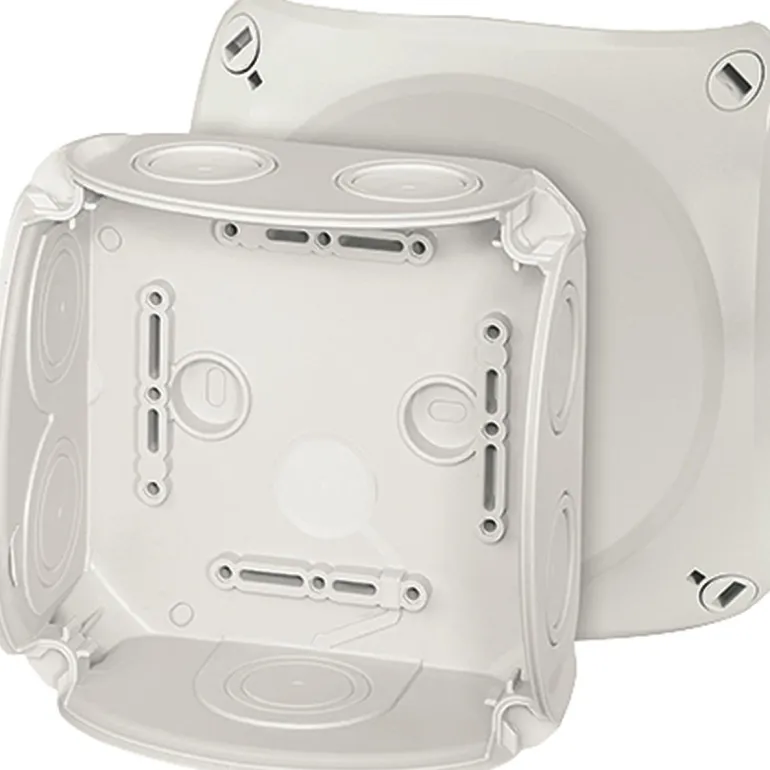 Kytkentärasia ilman liittimiä, integroidut elastiset kalvot, jotka voidaan helposti irrottaa ennen kaapelin asettamista kaapeliliitosten kautta. Kaapelin läpivienti pohjassa mahdollistaa kansiiruuvien tiivistämisen ilman lisävarusteita. Sisältää kiinnityshihnat ja ulkoseinäkiinnittimet