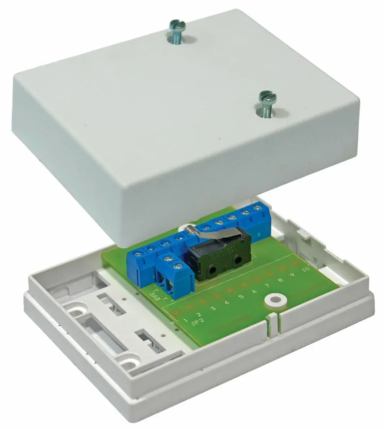 Kytkentärasia, ilkivaltasuojakytkin. Ruuviliittimet, joista 2 ilkivaltasuojakytkintä varten.