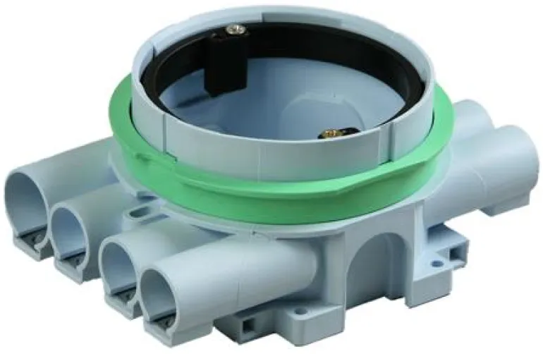 Kytkentärasia yksittäiselle tai kaksoiskipsilevylle, vihreä välirengas poistetaan, jos kyseessä on kaksoiskipsilevy. Rasiassa on säädettävä kiinnitysrengas.