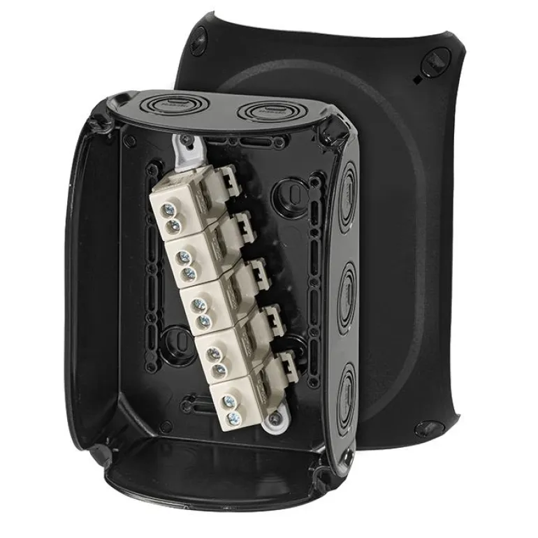 Kytkentärasia lasikuituvahvistettua polykarbonaattia vaativiin ympäristöihin asennettavaksi. Nimellisjännite 690V. Hyvä UV-kestävyys. Laatikossa on 5-napainen liitin kaapeleille Toimitetaan läpivientiaukkoineen ja aukoilla erikseen tilattaville ruuviliittimille. Laatikot ovat Länsförsäkringarin suosittelemia käytettäväksi maatalouskäyttöön.Kansissa on pikalukitus ja näkyvä lukitusasento. Monivaiheiset läpivientiaukot erikokoisille kaapelikiinnikkeilleja myös kaapeliläpivienti pohjassa Kaikki liittimet kahdella kiinnikkeellä napaa kohden, jotka voidaan asettaa eri liitinasentoihin ja eri kiinnitysvaihtoehdoilla. Korotetut liittimet, joissa on runsaasti tilaa liitännöille sekä kyky liittää eri johdinkokoja ja kaapelityyppejä. Laatikon mukana toimitetaan aina ulommat liittimet