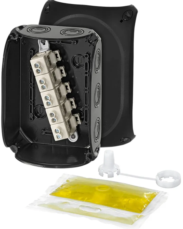 Kytkentärasia mustaa polykarbonaattia, kaksikomponenttinen geeli. Kun geeli on kovettunut, rasiasta tulee täysin vedenpitävä ja se mahtuu alttiisiin ympäristöihin.