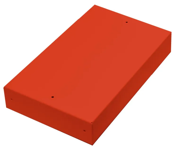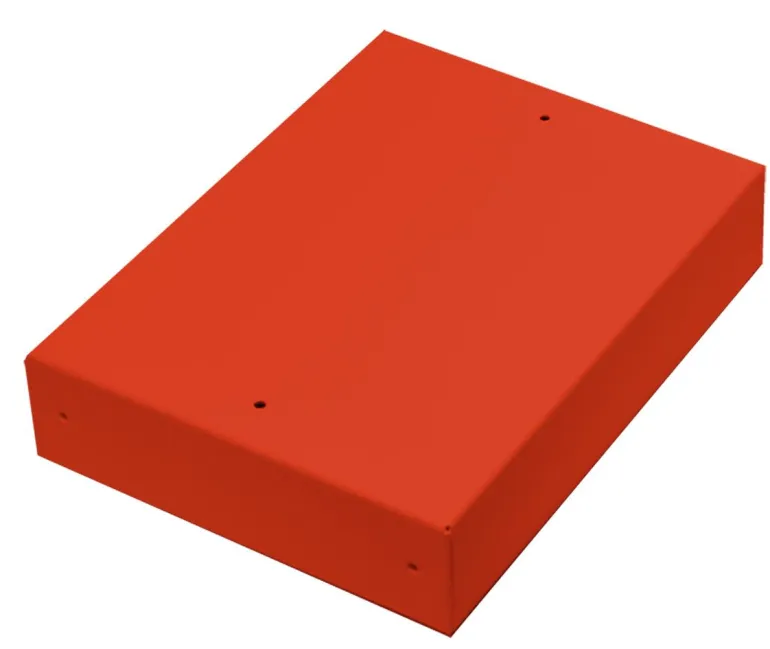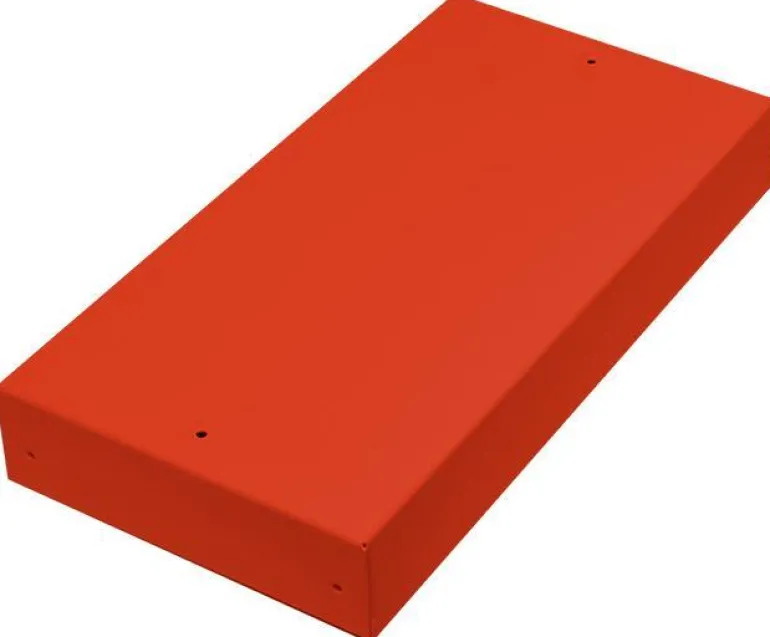 Sinkitystä pellistä valmistettu tukeva laatikko, jossa maalattu punainen kansi ja lyhyellä sivulla esirei’itetyt ulostulot, jotka on peitetty muovitulpalla. Sopii kaikkiin Fatum-sarjan vakiomoduulien liittimiin, valmius moduulille.