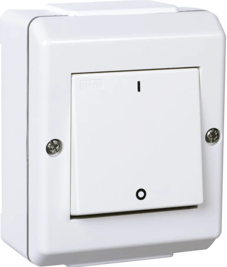 Valkoinen kytkin halogeenittomasta kestomuovista. Johtimien ruuviliitäntä.