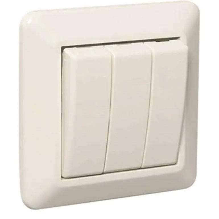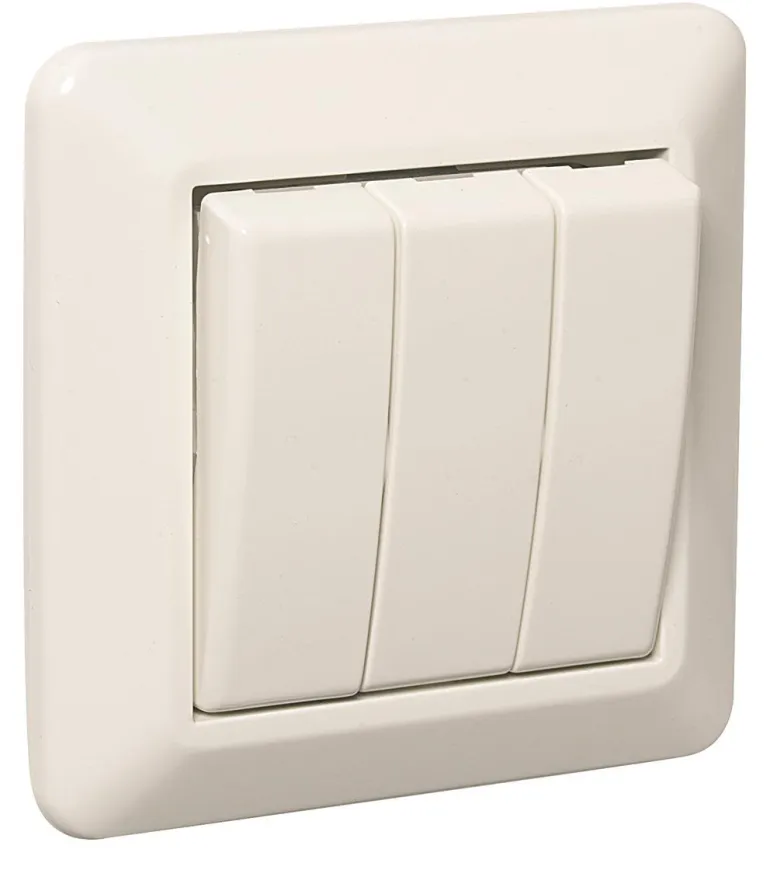 Kytkin 3×1-napaisella ja RS-ruuvilla, upotettavaksi. Mallissa on johdinten ruuviliitos hissikiristimellä ja mitat 82 x 84 mm ja asennussyvyys 11,5 mm. Voidaan täydentää tiivistedamaskilla ja kehyksellä upotettavaa asennusta varten. Kanta, keinukytkin ja runko on valmistettu halogeenivapaasta termoplastista.