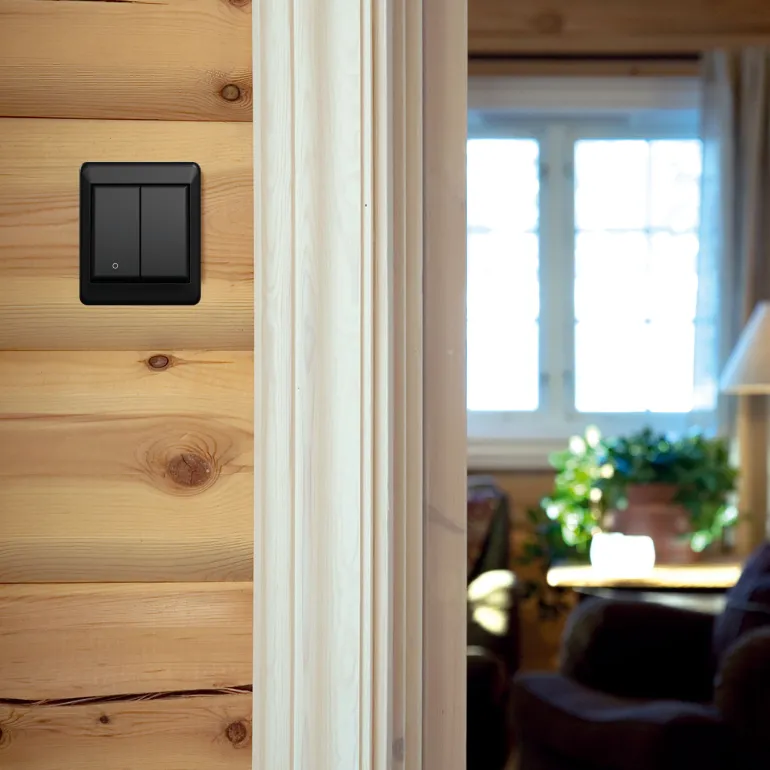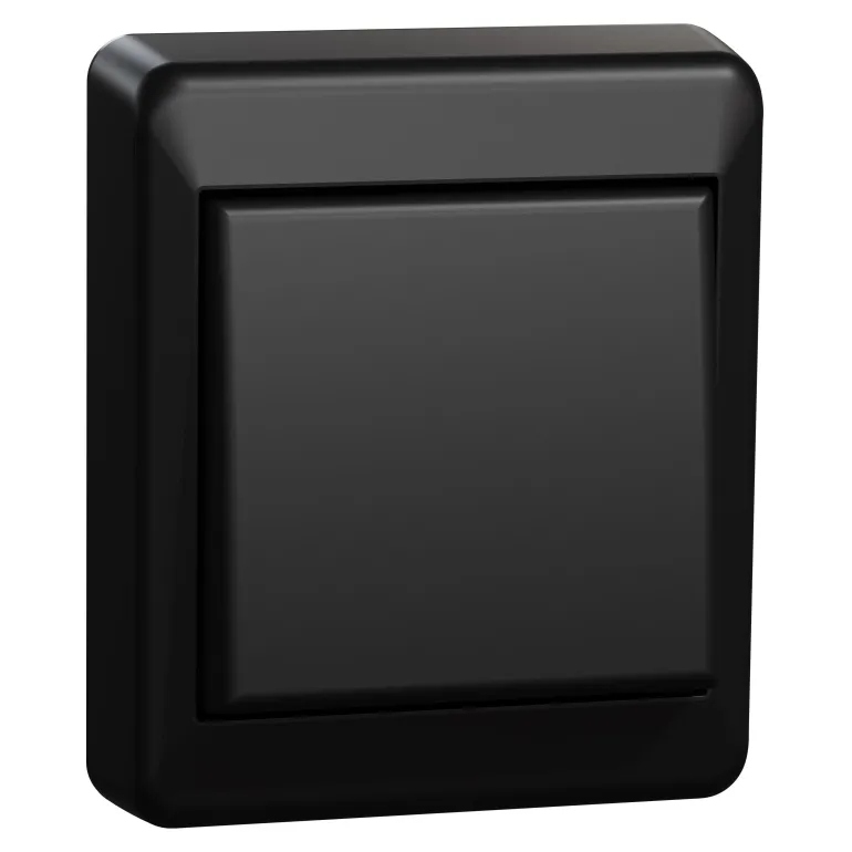 Musta pinta-asennettava kytkin vipupainikkeella ja taustalevyllä. Valmistettu halogeenittomasta kestomuovista. Kiinnitysruuvien väli 38mm.