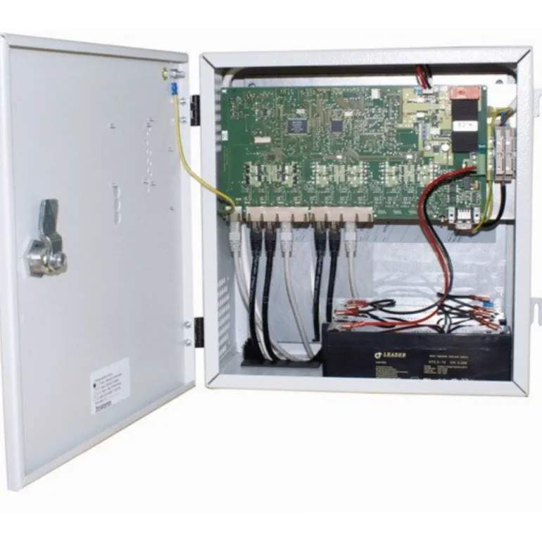PoE-kytkin ja akkuvarmennus 12 portille. IEEE 802.3at (25,5 W/portti). Käyttöön tarvitaan 4 x 7,2 Ah paristoa. Seinäasennus.