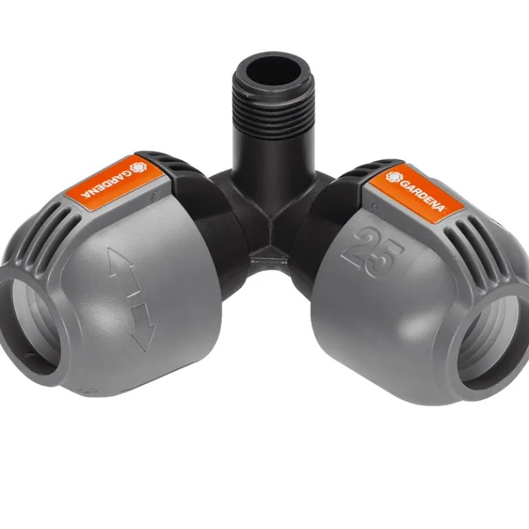 Kulmaliitin, koko 25 mm x 1/2″, uroskierre. GARDENA-sadetinjärjestelmässä liitintä käytetään S 80 -upposadettimen (1569-26) ja turbiinikäyttöisten T 100- ja T 200 -upposadettimien (8201-29 ja 8203-29) liittämiseen alueen kulmissa