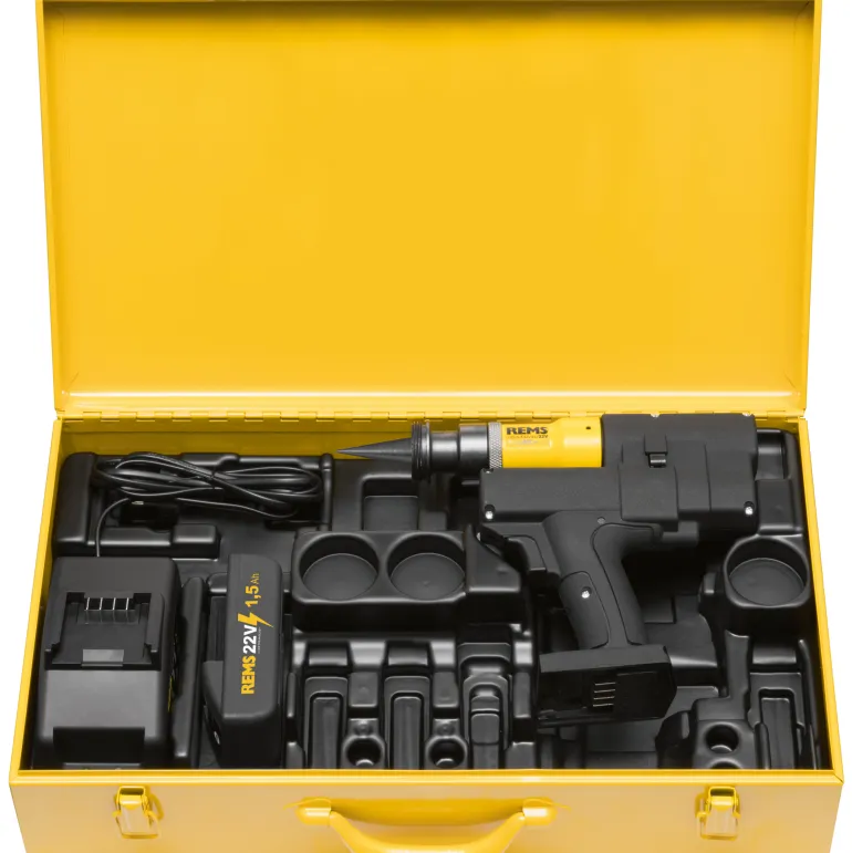REMS Akku-Ex-Press P-CEF 22 V ACC Basic-Pack on 20 kN:n akkukäyttöinen putken laajennustyökalu muoviputkien nopeaan laajentamiseen Ø 16 – 40 mm. Sähköhydraulinen käyttö, automaattinen palautus, tehokas akkukäyttöinen moottori 21,6 V, teho 380 W, kestävä planeettavaihteisto, epäkeskomäntäpumppu ja kompakti korkean hyötysuhteen hydrauliikkajärjestelmä. Turvakytkin.