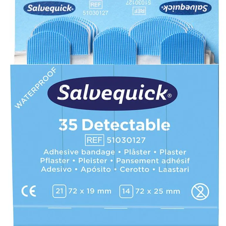 Salvequick 51030127 Blue Detectable on allergiatestattuja sinisiä laastareita, jotka on erityisesti suunniteltu käytettäväksi elintarviketeollisuudessa, koska ne ovat havaittavissa useimmilla metallinpaljastimilla ja helposti löydettävissä visuaalisesti.